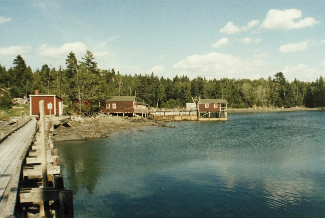 The former lobster-sorting shacks and tool sheds pictured here now stand as the site of The Bar and Pavilion. Photo courtesy of Kim Ford, 1980s.
